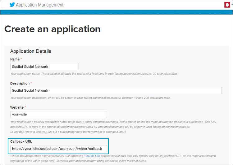 3). Provide the required information. For Callback URL, enter https://your-site.socibd.com/user/auth/twitter/callback