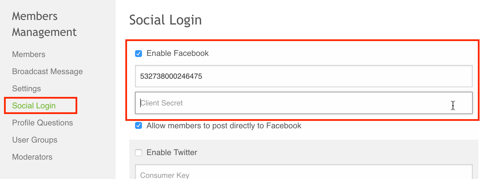 In Socibd admin > Members Management > Social Login, and paste app ID and app secret keys, check "Enable Facebook", then click "Save" button.