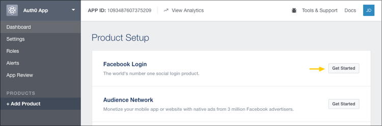 On the Product Setup page that follows, click Get Started next to Facebook Login: