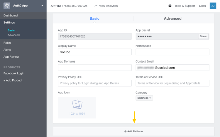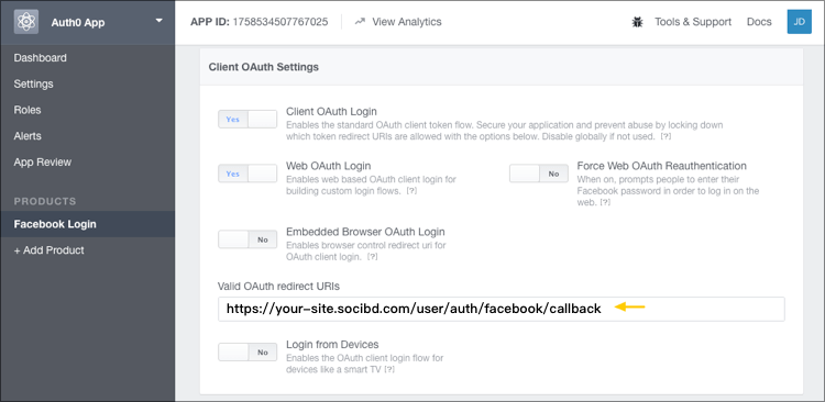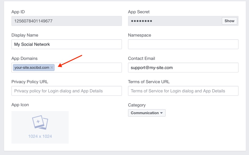 Save a copy of the App ID and App Secret to enter into the Settings page of you site on Socibd as described in Step 8.