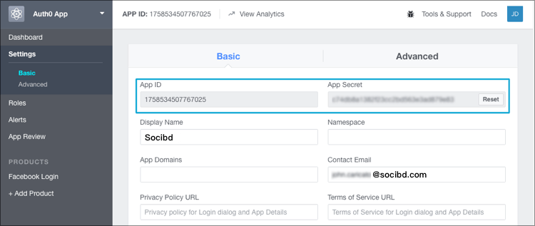 Click Show to reveal the App Secret. (You may be required to re-enter your Facebook password.)